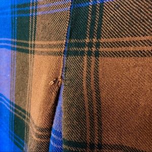 Blue and orangey-brown plaid print. Extra soft! Button down, collared, long sleeve with split sides. Size XS. Used, good condition, small hole/tear the size of a nickel on back, pictured. Hardly noticeable if you're using it as a layered piece under a Moto jacket, or worn with long hair down.