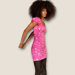 Features: Bodycon mini dress featuring an all over print and ruching throughout. Topped with elasticated cap sleeves at the scoop neck. Really cute for a Barbiecore, Coquette aesthetic