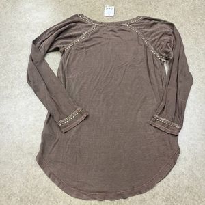 Stylish brown long sleeve top. Features decorative trim. Perfect for casual wear.