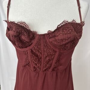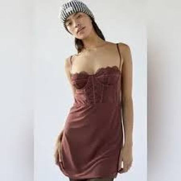 Get a sultry look with this Urban Outfitters brown bustier dress, the intricate lace detail and figure-hugging silhouette make it perfect for a night out.