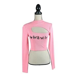 Urban Outfitters Butterfly Cutout Crop Top in a size medium. Has an asymmetrical chest cutout and embroidered butterflies. All over rib knit. Very stretchy. Measures approximately 12 1/2” armpit to armpit, and 15 1/2” in length. 100% cotton. In great condition.