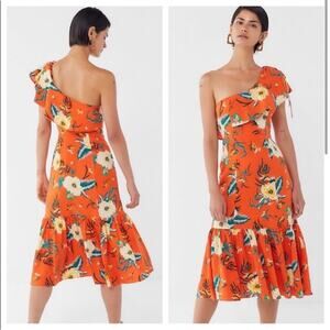 Urban Outfitters Carmen Orange Tropical Floral Linen Blend One Shoulder Ruffle Midi Dress
