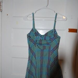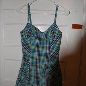 Chic checkered dress with spaghetti straps. Features a blend of blue, green, and black.