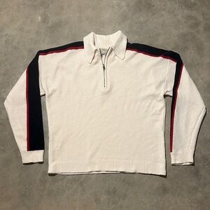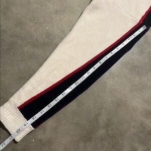 Cream colored pullover with navy blue and red stripes down sleeves. Excellent used condition.