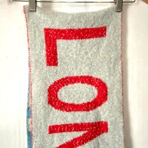 Soft, cozy knit scarf cut long + wide with contrasting intarsia lettering across length.