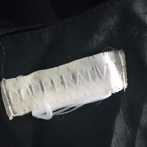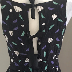 Cooperative Black Dress with abstract shapes covered in dark polka dots. Three cute bows in back give extra detail. Shoulder to hem approximately 31" Measures 14.5 across at waist. Side zipper. 100% Rayon. Hand wash, cold, separately.