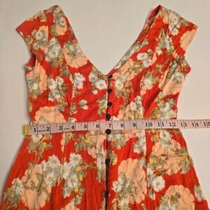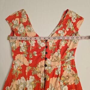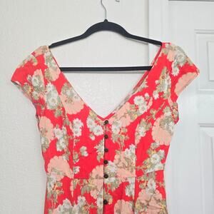 Urban Outfitters Coral Floral Babydoll Midi Dress V-Neck Cap Sleeve Button Sz XS