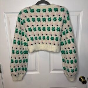 This charming cardigan features a cream base adorned with a playful green shamrock pattern, perfect for adding a festive touch to your wardrobe. Crafted from a medium to heavy knit, it offers warmth and style for cooler days. The cropped design makes it a trendy choice for casual outings or themed celebrations.