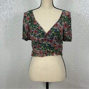 UO floral V-neck crop top with a vibrant Cottage Core Floral design. Perfect for a stylish and comfortable look. Cropped length with short sleeves with elastic. Sweetheart neckline with ruching down the center. Multicolor botanical print. Bodice is fully lined. Excellent Condition!