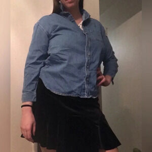 Urban Outfitters Denim Chambray Button Down Size XS. This is from the BDG denim collection. It’s a size XS but for reference I’m a size medium and it fits me well. It would definitely be an oversized fit for an XS. This garment is perfect for layering! Excellent condition, no rips or tears.