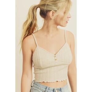 Soft, lightweight knit top featuring triangle bust, lettuce-edge hem, and button detail. Adjustable spaghetti straps for better fitting.
