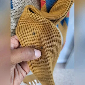 Does show signs of flaws(on the back side of the right sleeve)