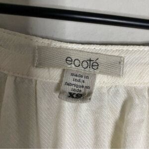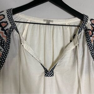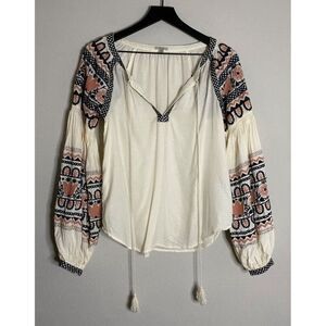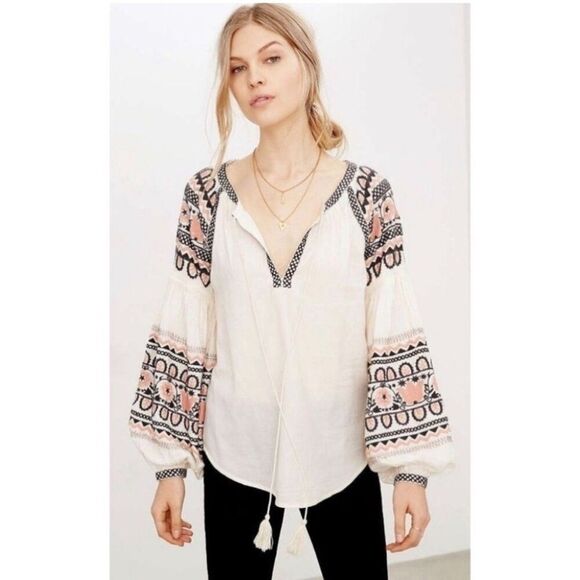 Boho embroidered puff sleeve top from Ecote for Urban Outfitters. Ivory with pink and black embroidery. Tassel tie. Size XS. Gently preowned condition with no tears or stains.