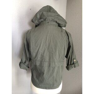 Classic olive green utility style jacket with a hood that can be tucked away when not in use.