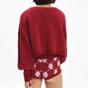 Urban Outfitters Out From Under Catching Feelings Fair Isle Print Cropped Pullover Sweater. Cropped length. Soft and fuzzy. Balloon sleeves with dropped shoulders. Boatneck. Boxy, relaxed fit. Woven fawn baby deer fair isle motif. 84% acrylic, 14% nylon, 1% spandex, 1% other fibers. Hand wash cold separately. Lay flat to dry. Matching shorts are NOT included.
