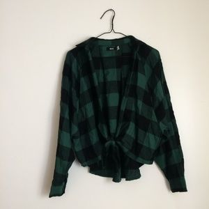 BDG by Urban Outfitters. Sold out & rare, no longer available at UO! Gently used condition - I only wore it a few times. Original retail price around $35. Womens size small. In the style “Courtney”. In a dark green color w/ black accents. Tie front knot & a high low hem. Has a plunging v neckline & collar. Super soft flannel in a relaxed fit silhouette. Long sleeves with button cuffs.