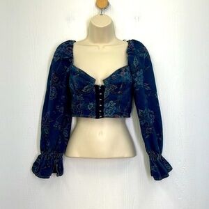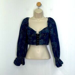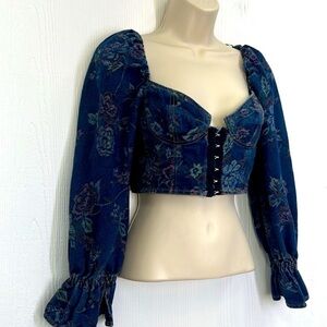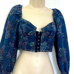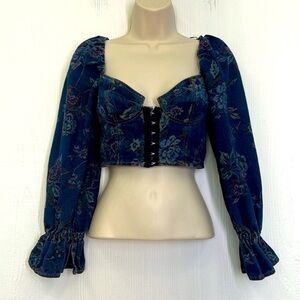 Urban Outfitters- Floral Denim Hook And Eye Closure Corset Ling Sleeve Crop Size Small