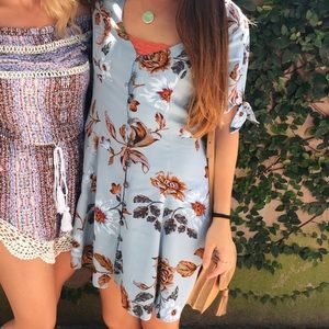 Floral skater dress with adorable tie sleeves and silver buttons down front. Like new condition-only worn once as pictured! Urban Outfitters brand is "Kimichi Blue"