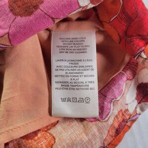 This Urban Outfitters floral mini skirt combines vibrant hues of red, pink, and orange with a breathable linen-viscose fabric, offering a stylish yet comfortable wardrobe addition.