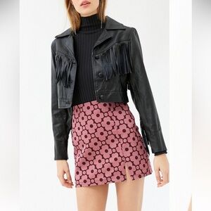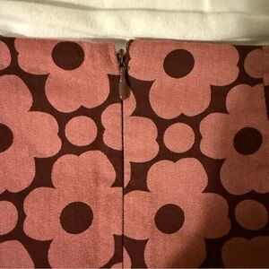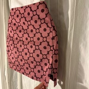 Chic and playful Urban Outfitters mini skirt featuring a bold retro floral print in rose-pink and chocolate brown. The flattering A-line silhouette, side slit detail, and hidden back zipper create an easy, vintage-inspired look. Mid-weight cotton-blend fabric with a touch of stretch for comfort and structure.