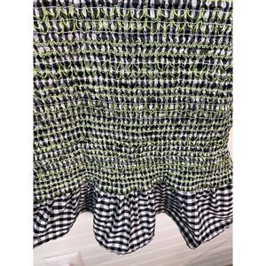 This Urban Outfitters dress features a smocked stitched dress with a black and white checked pattern, sleeveless arms, and a drop waist with a mini hem.
