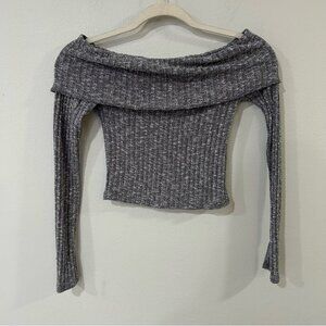 This chic off-the-shoulder sweater from Urban Outfitters features a heather gray hue and a stylish folded neckline. Crafted from ribbed knit material, it offers a comfortable and form-fitting silhouette, perfect for adding a touch of elegance to any outfit.