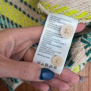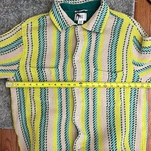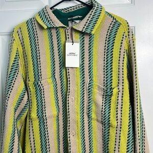Stylish striped jacket with button closure. Features green and yellow tones. Perfect for layering.