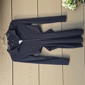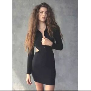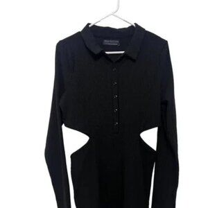 Brand new without tags! Fitted mini dress with a polo collar at the buttoned bodice. Cut short with cutout detailing at the hip. Long sleeves, ribbed, stretchy material.