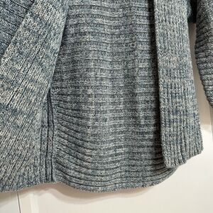 Women's open front cardigan is a heavy knit, with a neutral heathered blue contrast thread.