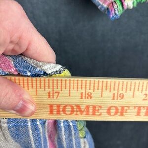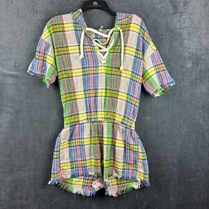 Vibrant plaid jumpsuit. Features lace-up front. Short sleeves with frayed edges. Perfect for casual outings.