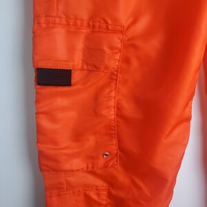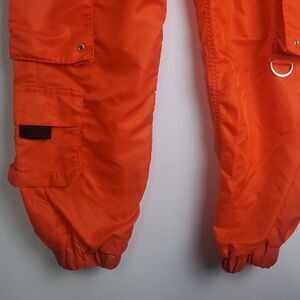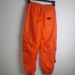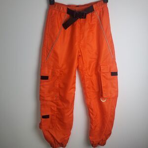 Bright orange cargo pants with a built-in adjustable belt and elastic cuffs