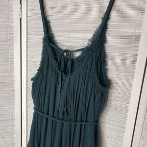 Flowy deep green jumpsuit with adjustable straps, back tie, and waist tie for custom fit—frayed hemline adds boho edge, pockets keep it practical. Ideal for festivals, beach days, or casual outings; drape that sways with every step for effortless, sun-soaked freedom!