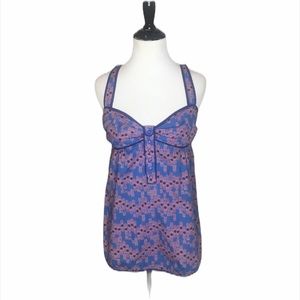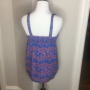 Geo shaped royal blue print baby doll top with adjustable straps. Smocked back and snap front. 100% cotton.