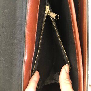 This is an awesome vintage-inspired messenger bag from Kimchi Blue (an Urban Outfitter's brand). It's a lovely cognac-brown shade, and has a reddish tint in bright lighting.