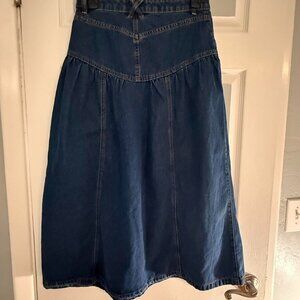 drop waist, denim midi, high waist, A-line, retro, casual, minimalist, lightweight, vintage-inspired, everyday wear