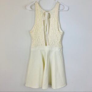 Pretty cream colored skater dress. Torso is all over lace. Fit and flare. Back ties at neckline, and leaves a large open keyhole that goes all the way to waistline for a backless look.