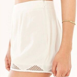 Urban Outfitters Kimchi Blue hotpants. Ivory colored shorts with triangle mesh cut outs along the hem, front and back. Lightly textured fabric, lined, side zipper closure with hook and eye.