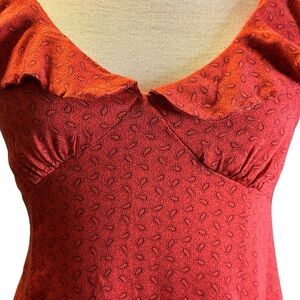 Urban Outfitters Kimchi Blue Daisy May Ruffle Dress Paisley Red Medium OB650399. Great condition see photos for details. Approximate measurements 33” shoulder to hem and 14” pit to pit. Side zip.