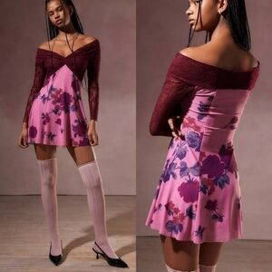 Urban Outfitters Kimchi Blue Sydney Off Shoulder Mini Dress in Pink Combo NWT