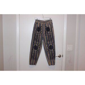 Urban Outfitters pants combine bold stripes with intricate black embroidery, showcasing a unique and fashionable design. Ideal for adding an artistic flair to any wardrobe, they're crafted for style-conscious individuals who appreciate distinctive clothing pieces. Durable materials ensure long-lasting wear.