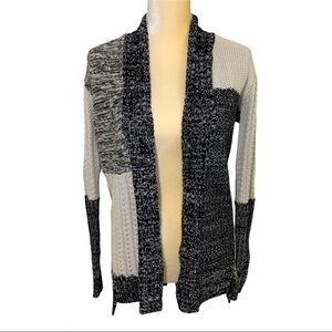 Open front cardigan. Knit fabric in cream/black/grey colorblock pattern. Oversize sweater style, loose and comfy fit.