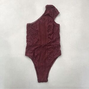 Size S dark red one shoulder bodysuit. Lace overlay. Chest 11.5in. Length about 24in from top of shoulder to bottom of groin.
