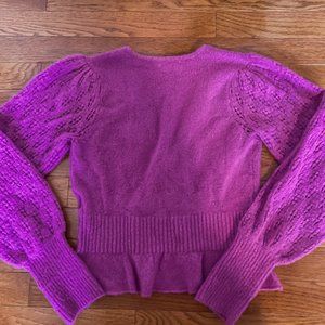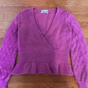 This sweater is perfect for spring. It has long, puffy sleeves and a deep, cross over v-neck.
