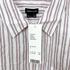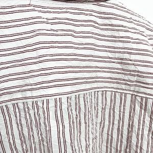 Urban Outfitters Standard Cloth Brody Crinkle Shirt. Color: White with burgundy red stripes. Oversized fit, runs big. Made with a heavier weight poplin woven fabric that has a wrinkled texture all over. Hidden button front placket. Long sleeves. Point collar. One chest patch pocket. Straight hem with side vents. 65% polyester, 35% cotton woven fabric. Machine wash cold. Tumble dry low.