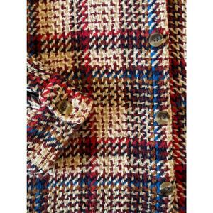 Cozy and stylish, this Urban Outfitters men’s plaid knit shirt/jacket is the perfect medium-weight layering piece for cooler weather. Features a textured woven knit fabric in a bold multicolor plaid pattern with shades of tan, red, navy, and blue. Designed with a button-up front, collared neckline, and relaxed fit for versatile styling — wear it as an overshirt, shacket, or light jacket. Perfect for fall or early spring outfits.
