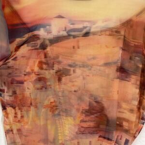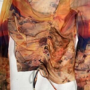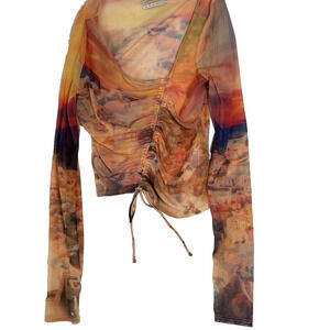 The Urban Outfitters Mesh Crop Top in medium size features a geometric pattern in multicolor, long sleeves with an off-center neckline, and a casual sleeve type. Made of polyester mesh fabric, this cropped blouse is perfect for the summer, fall, and spring seasons. Produced by Urban Outfitters, it offers a regular fit for women who appreciate unique and stylish clothing from Vietnam. With a hand wash only care label, this top is a trendy addition to any wardrobe.
