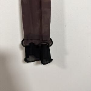 The Urban Outfitters Mesh Sheer Lace Layering Top Shirt is a stylish and versatile piece for women. This fitted top in size Large features a high neck and long sleeves, with a pullover closure for easy wear. Made from lace and mesh fabric, it offers a stretchy and comfortable fit, perfect for various occasions such as casual outings, parties, or travel. The floral pattern with ruffle accents adds a bohemian touch to the brown blouse, making it a chic addition to any wardrobe, ideal for all seasons.