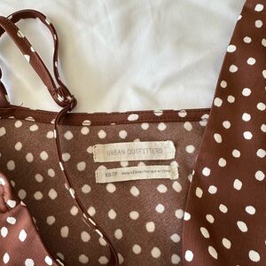 Urban Outfitters Midi Dress (B148) Brown and white polka dot dress from Urban Outfitters, size XS. Adjustable straps, side zipper, and side slit. Silky material. Excellent condition. Approx 12" across, 37" length