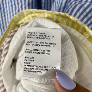 Features: woven seersucker dress, striped print, colorblocked rainbow design, elastic top hem, short sleeves, self-tie bow at the bodice, elastic waist, A-line silhouette, unlined