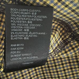 Soft and lightweight polyester, viscose and elastane has a little stretch. Front notch slit. Back zip. Great preowned condition- no flaws- like new.